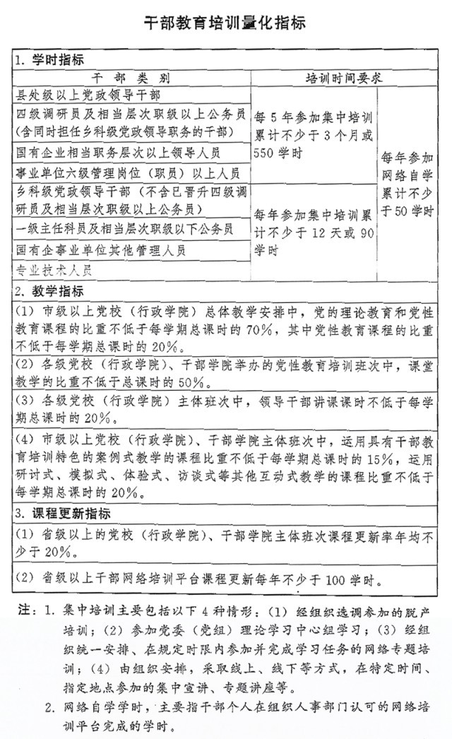 ?。ǘ熧Y隊(duì)伍建設(shè)。加大名師培養(yǎng)引進(jìn)力度,把干部教育培訓(xùn)師資納入各級人才政策支持范疇,努力造就一批對黨忠誠、精通黨的創(chuàng)新理論、授課水平高、在學(xué)科領(lǐng)域有影響力的知名教師。完善專職教師知識更新和實(shí)踐鍛煉制度,加強(qiáng)師資隊(duì)伍黨性教育和業(yè)務(wù)培訓(xùn),國家級干部教育培訓(xùn)機(jī)構(gòu)每年培訓(xùn)2000名地方和部門行業(yè)培訓(xùn)機(jī)構(gòu)的骨干教師,省級黨校(行政學(xué)院)5年內(nèi)將市、縣兩級黨校(行政學(xué)院)教師培訓(xùn)一遍。鼓勵國家級干部教育培訓(xùn)機(jī)構(gòu)和省、市兩級黨校(行政學(xué)院)教師到基層黨校(行政學(xué)校)、?。ㄗ灾螀^(qū)、直轄市)黨性教育干部學(xué)院支教。評聘干部教育名師,推廣“名師帶徒”等方式,利用“名師工作室”等平臺,加強(qiáng)中青年骨干教師培養(yǎng)。大力推進(jìn)領(lǐng)導(dǎo)干部上講臺。注重在領(lǐng)導(dǎo)干部、先進(jìn)模范人物、優(yōu)秀基層干部中遴選培養(yǎng)師資。分級建設(shè)師資庫。探索建立符合干部教育培訓(xùn)特點(diǎn)的師資隊(duì)伍考核評價(jià)體系和職稱評審制度。