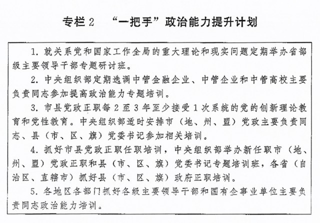 ?。ǘ┩怀觥瓣P(guān)鍵少數(shù)”政治訓(xùn)練。堅(jiān)持把政治訓(xùn)練貫穿干部成長全周期,使干部的政治素養(yǎng)、政治能力與擔(dān)負(fù)的領(lǐng)導(dǎo)職責(zé)相匹配。強(qiáng)化“一把手”政治培訓(xùn),有計(jì)劃地選調(diào)地方、部門、國有企事業(yè)單位主要負(fù)責(zé)同志到黨校(行政學(xué)院)、干部學(xué)院參加專題培訓(xùn)。實(shí)施“一把手”政治能力提升計(jì)劃(專欄2)。?。ㄗ灾螀^(qū)、直轄市)、市(地、州、盟)、縣(市、區(qū)、旗)黨政領(lǐng)導(dǎo)班子成員每2至3年到黨校(行政學(xué)院)、干部學(xué)院至少接受1次系統(tǒng)的黨的創(chuàng)新理論教育和黨性教育,5年內(nèi)累計(jì)不少于2個月。圍繞提高政治能力和領(lǐng)導(dǎo)能力,加強(qiáng)機(jī)關(guān)司局長、處長任職培訓(xùn)。重視對女干部、少數(shù)民族干部、黨外干部等的政治培訓(xùn)。加強(qiáng)對高層次人才的政治引領(lǐng),中央組織部會同有關(guān)單位每年組織一定數(shù)量人才開展國情研修。