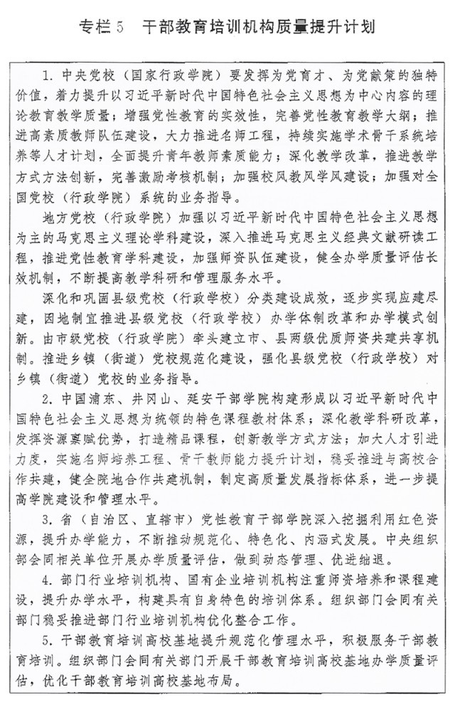 ?。ㄒ唬┡嘤?xùn)機(jī)構(gòu)建設(shè)。推進(jìn)各級黨校(行政學(xué)院)建設(shè),以教學(xué)督導(dǎo)、師資培養(yǎng)、質(zhì)量評估為重點(diǎn),強(qiáng)化上級黨校(行政學(xué)院)對下級黨校(行政學(xué)院)的業(yè)務(wù)指導(dǎo),不斷提高辦學(xué)水平。推進(jìn)縣級黨校(行政學(xué)校)分類建設(shè)。加強(qiáng)社會主義學(xué)院建設(shè)。進(jìn)一步提升部門行業(yè)培訓(xùn)機(jī)構(gòu)、國有企業(yè)培訓(xùn)機(jī)構(gòu)辦學(xué)質(zhì)量。加強(qiáng)對干部教育培訓(xùn)高?;?、基層干部教育培訓(xùn)機(jī)構(gòu)辦學(xué)指導(dǎo)。開展黨校(行政學(xué)院)、省(自治區(qū)、直轄市)黨性教育干部學(xué)院、干部教育培訓(xùn)高?;剞k學(xué)質(zhì)量評估。加強(qiáng)各類黨員干部教育培訓(xùn)機(jī)構(gòu)規(guī)范管理,嚴(yán)控新設(shè)以黨員干部為培訓(xùn)對象的培訓(xùn)機(jī)構(gòu)。支持地方、部門聯(lián)合開展培訓(xùn),鼓勵干部教育培訓(xùn)機(jī)構(gòu)開展區(qū)域協(xié)作交流,推動優(yōu)質(zhì)培訓(xùn)資源共享。實(shí)施干部教育培訓(xùn)機(jī)構(gòu)質(zhì)量提升計(jì)劃(專欄5)。