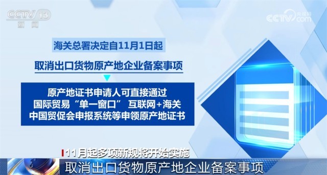 海關總署決定自11月1日起,取消出口貨物原產(chǎn)地企業(yè)備案事項,原產(chǎn)地證書申請人可直接通過國際貿(mào)易“單一窗口”“互聯(lián)網(wǎng)+海關”、中國貿(mào)促會申報系統(tǒng)等申領原產(chǎn)地證書,進一步優(yōu)化跨境貿(mào)易營商環(huán)境,提升貿(mào)易便利。