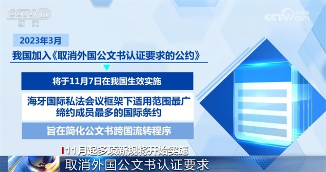 今年3月,我國加入《取消外國公文書認證要求的公約》,《公約》將于11月7日在我國生效實施。《公約》是海牙國際私法會議框架下適用范圍最廣、締約成員最多的國際條約,旨在簡化公文書跨國流轉程序。11月7日起,中國送往其他締約國使用的公文書僅需辦理《公約》規(guī)定的附加證明書,即可送其他締約國使用,無需辦理中國和締約國駐華使領館的領事認證。其他締約國公文書送中國內(nèi)地使用,只需辦理該國附加證明書,無需辦理該國和中國駐當?shù)厥诡I館的領事認證。