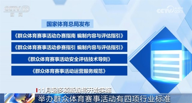 國家體育總局發(fā)布的《群眾體育賽事活動辦賽指南 編制內(nèi)容與評估指引》《群眾體育賽事活動參賽指引 編制內(nèi)容與評估指引》《群眾體育賽事活動安全評估技術導則》《群眾體育賽事活動運營服務規(guī)范》四項體育行業(yè)標準自11月1日起實施。這些標準明確了群眾體育賽事活動安全評估的流程、策劃、實施和總結,運營服務的基本要求、服務要求、管理要求等內(nèi)容,適用于各級各類群眾體育賽事活動的舉辦。