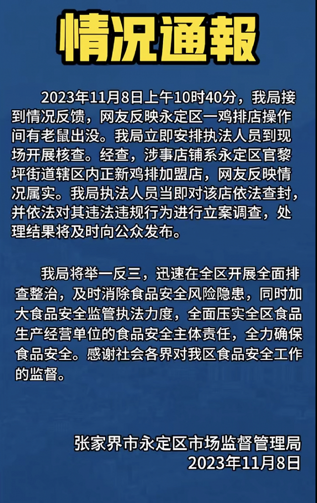 官方通報“張家界景區(qū)小吃店老鼠扎堆亂竄”:屬實,涉事正新雞排加盟店已被查封