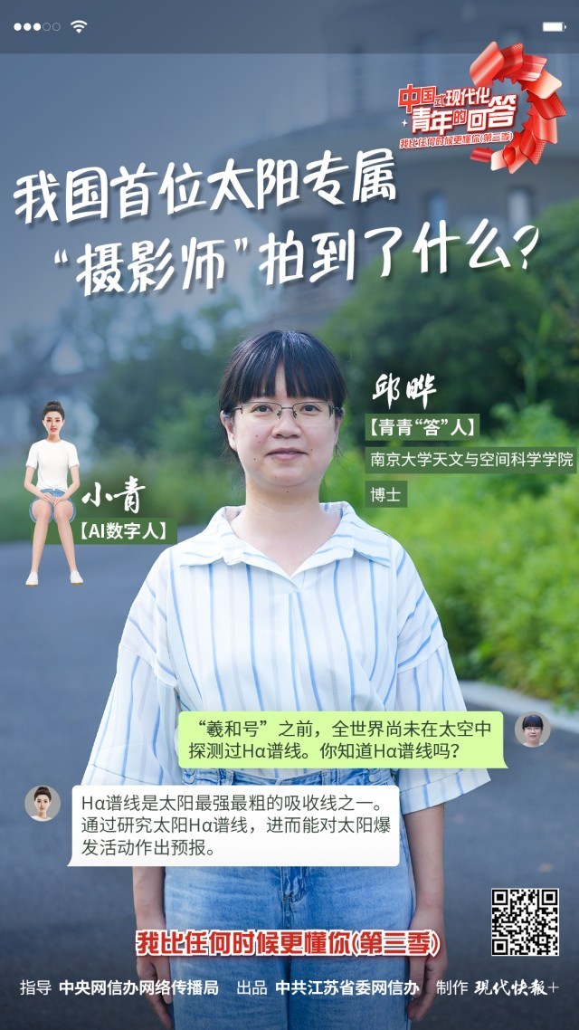 11月7日,“中國式現(xiàn)代化·青年的回答——我比任何時(shí)候更懂你(第三季)”系列短視頻之《我國首位太陽專屬“攝影師”拍到了什么?》正式上線。本集視頻中,青青“答”人——南京大學(xué)天文與空間科學(xué)學(xué)院博士邱曄和AI數(shù)字人小青,為大家展示了我國首顆探日衛(wèi)星“羲和號(hào)”拍攝到的畫面,解釋了“羲和號(hào)”超長全稱里的兩個(gè)關(guān)鍵詞的含義。