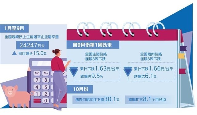 自9月份第1周以來,全國生豬價(jià)格連續(xù)8周下跌,累計(jì)下跌1.63元/公斤,跌幅達(dá)9.5%;全國豬肉價(jià)格連續(xù)8周下跌,累計(jì)下跌1.66元/公斤,跌幅達(dá)6.1%。10月份第4周,全國豬肉平均價(jià)格25.60元/公斤,比前一周下跌1.2%,同比下跌38.5%。