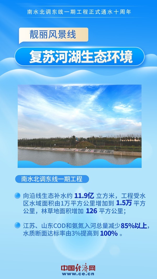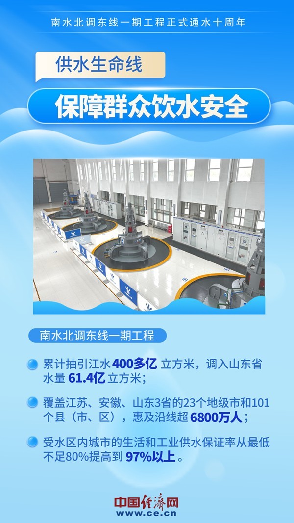 10年來(lái),長(zhǎng)江水、淮河水、黃河水等水系構(gòu)筑起的縱橫水網(wǎng),由一渠清水串連,鋪陳在東方大地上,連接起江蘇、安徽、山東3省的23個(gè)地級(jí)市和其轄內(nèi)的101個(gè)縣(市、區(qū))用水需求,惠及沿線(xiàn)超6800萬(wàn)人。