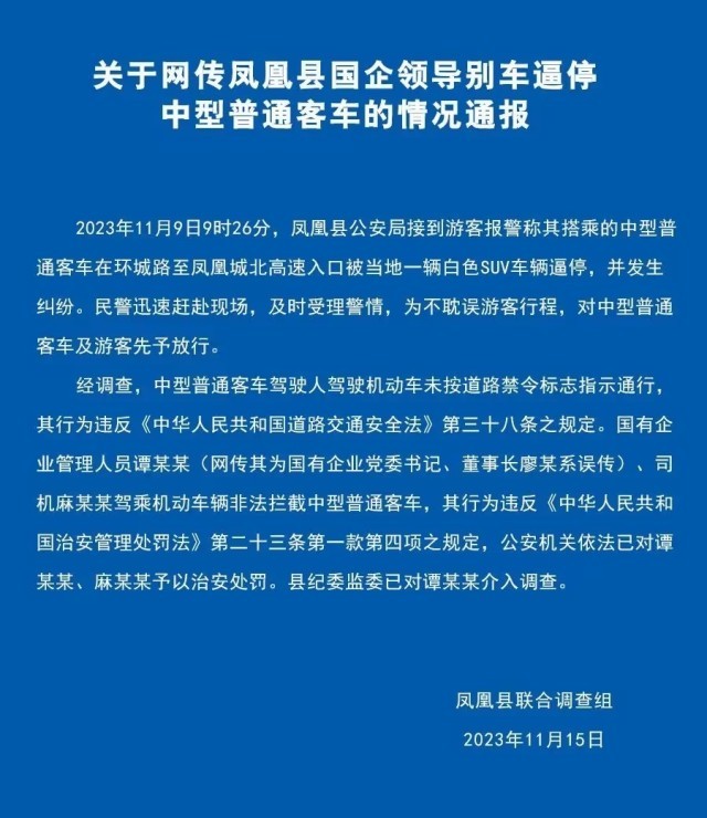 央視網(wǎng)消息:據(jù)鳳凰融媒微信公眾號(hào)消息,11月15日,鳳凰縣聯(lián)合調(diào)查組發(fā)布情況通報(bào),經(jīng)調(diào)查,中型普通客車(chē)駕駛?cè)笋{駛機(jī)動(dòng)車(chē)未按道路禁令標(biāo)志指示通行,其行為違反相關(guān)規(guī)定。國(guó)有企業(yè)管理人員譚某某 (網(wǎng)傳其為國(guó)有企業(yè)黨委書(shū)記、董事長(zhǎng)廖某系誤傳)、司機(jī)麻某某駕乘機(jī)動(dòng)車(chē)輛非法攔截中型普通客車(chē),其行為違反相關(guān)規(guī)定,公安機(jī)關(guān)依法已對(duì)譚某某、麻某某予以治安處罰??h紀(jì)委監(jiān)委已對(duì)譚某某介入調(diào)查。