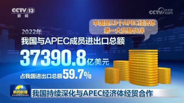 央視網(wǎng)消息(新聞聯(lián)播):商務部最新數(shù)據(jù)顯示,2022年,我國與APEC成員進出口總額為37390.8億美元,占我國進出口總額的59.7%。中國是13個APEC經(jīng)濟體的第一大貿(mào)易伙伴。
