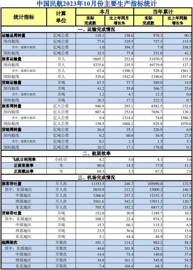民航局11月20日發(fā)布10月份主要生產(chǎn)指標統(tǒng)計顯示,今年10月,運輸總周轉量達到110.1億噸公里,同比增長158.6%;中國民航旅客運輸量達到5605.2萬人,同比增長252%;10月貨郵運輸量為67.5萬噸,同比增長37.7%。