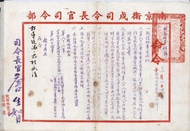 這是一份成文于1937年12月11日24時,有關(guān)“死守南京”的作戰(zhàn)命令——“衛(wèi)參作第44號”命令。該命令由當時南京衛(wèi)戍司令長官唐生智向教導(dǎo)總隊隊長桂永清下達,右上方加蓋有“南京衛(wèi)戍司令長官關(guān)防”章。
