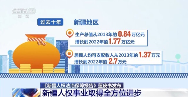 會議期間,還舉行了《新疆人權法治保障報告》藍皮書揭幕儀式。過去十年,新疆地區(qū)生產總值從2013年的0.84萬億元增長到2022年的1.77萬億元,居民人均可支配收入從2013年的1.37萬元增長到2022年的2.7萬元。