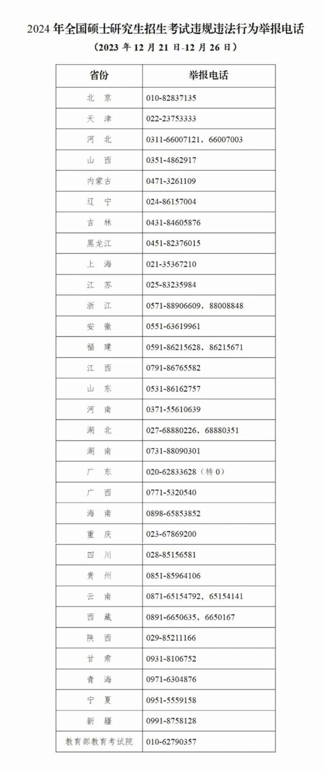 教育部和各?。▍^(qū)、市)教育招生考試機(jī)構(gòu)將開通2024年研考舉報(bào)電話,考生及社會(huì)各界人士可及時(shí)舉報(bào)反映有關(guān)問題線索。教育部及各省(區(qū)、市)將會(huì)同有關(guān)部門根據(jù)舉報(bào)線索第一時(shí)間核查處理,堅(jiān)決維護(hù)風(fēng)清氣正的研考環(huán)境。