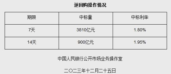 中新網12月25日電 據(jù)央行網站消息,為維護年末流動性合理充裕,2023年12月25日人民銀行以利率招標方式開展了4710億元7天期和14天期逆回購操作。具體情況如下: