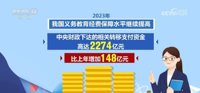 2023年,我國義務(wù)教育經(jīng)費(fèi)保障水平繼續(xù)提高,中央財政下達(dá)的相關(guān)轉(zhuǎn)移支付資金高達(dá)2274億元,比上年增加148億元。2023年,一系列義務(wù)教育重大工程項目繼續(xù)實(shí)施,讓中小學(xué)辦學(xué)條件不斷優(yōu)化。其中,義務(wù)教育薄弱環(huán)節(jié)改善與能力提升項目中央安排330億元,支持各地義務(wù)教育學(xué)校標(biāo)準(zhǔn)化建設(shè)。