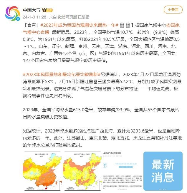 央視網(wǎng)消息:中國天氣 援引國家氣候中心國家氣候中心官博 最新消息,2023年,全國平均氣溫10.7℃,較常年(9.9℃)偏高0.8℃,為1961年以來最高,打破2021年10.5℃記錄。全國大部地區(qū)氣溫偏高0.5~1℃。山東、遼寧、新疆、貴州、云南、天津、湖南、河北、四川、河南、北京、內(nèi)蒙古、廣西等13個?。ㄊ?、區(qū))氣溫均為1961年以來歷史最高,全國共127個國家氣象站日最高氣溫突破歷史極值。