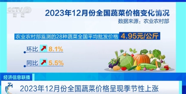 央視網(wǎng)消息:來關(guān)注“菜籃子”價格。農(nóng)業(yè)農(nóng)村部最新數(shù)據(jù)顯示,2023年12月份全國菜籃子指數(shù)為123.32,環(huán)比上漲6.89個點,蔬菜價格呈現(xiàn)季節(jié)性上漲。