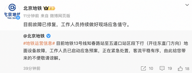北京地鐵:13號(hào)線故障已修復(fù)