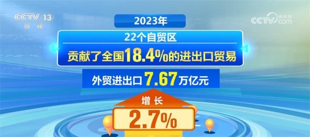 2023年,我國自貿(mào)試驗(yàn)區(qū)擴(kuò)容至22個。22個自貿(mào)區(qū)貢獻(xiàn)了全國18.4%的進(jìn)出口貿(mào)易,外貿(mào)進(jìn)出口7.67萬億元,增長2.7%。
