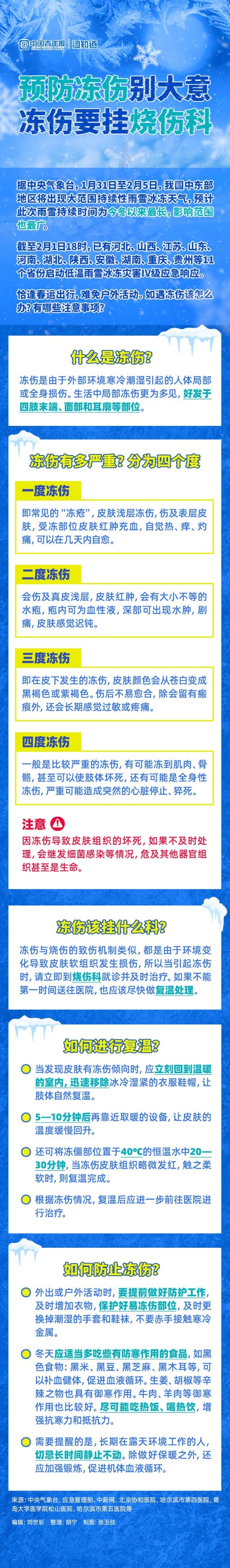2月1日,中央氣象臺發(fā)布冰凍橙色預(yù)警。據(jù)預(yù)報,這是2009年以來冬季最強雨雪冰凍天氣,預(yù)計將持續(xù)6天,10省份將出現(xiàn)暴雪或大暴雪。恰逢春運出行,在旅途中也要謹(jǐn)防凍傷。如遇凍傷該怎么辦?如何緊急補救?想要就醫(yī)該掛什么科室?轉(zhuǎn)發(fā)收藏,祝福大家平安祥和迎春到,開心順利過大年。