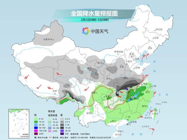 未來三天(2月2日至4日),中東部大范圍雨雪冰凍天氣過程進入鼎盛時段,江漢至黃淮一帶將遭遇強降雪,局地或現(xiàn)大暴雪,江南、華南局地有暴雨,并可能出現(xiàn)強對流天氣。在冷空氣和雨雪天氣共同影響下,中東部多地濕冷感明顯。春運高峰期將至,公眾需注意出行安全,做好防寒保暖措施。