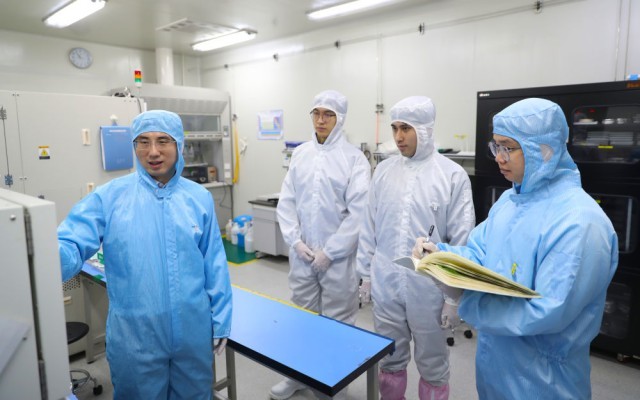 在位于沈陽市的中國科學院金屬研究所納米碳基電子器件超凈實驗室,孫東明(左一)與指導(dǎo)的研究生一起討論反應(yīng)離子刻蝕工藝設(shè)備的使用方法和注意事項(2月24日攝)。