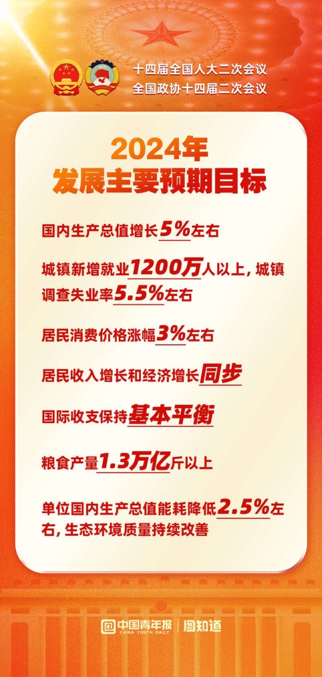 國內(nèi)生產(chǎn)總值增長5%左右,城鎮(zhèn)新增就業(yè)1200萬人以上,糧食產(chǎn)量1.3萬億斤以上......2024年發(fā)展主要預(yù)期目標(biāo)公布,向著這些目標(biāo)共同奮斗!