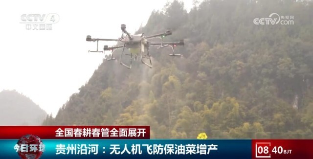 在貴州沿河,農技人員組織專業(yè)飛手進行無人機統(tǒng)防統(tǒng)治作業(yè),確保油菜增產增收。