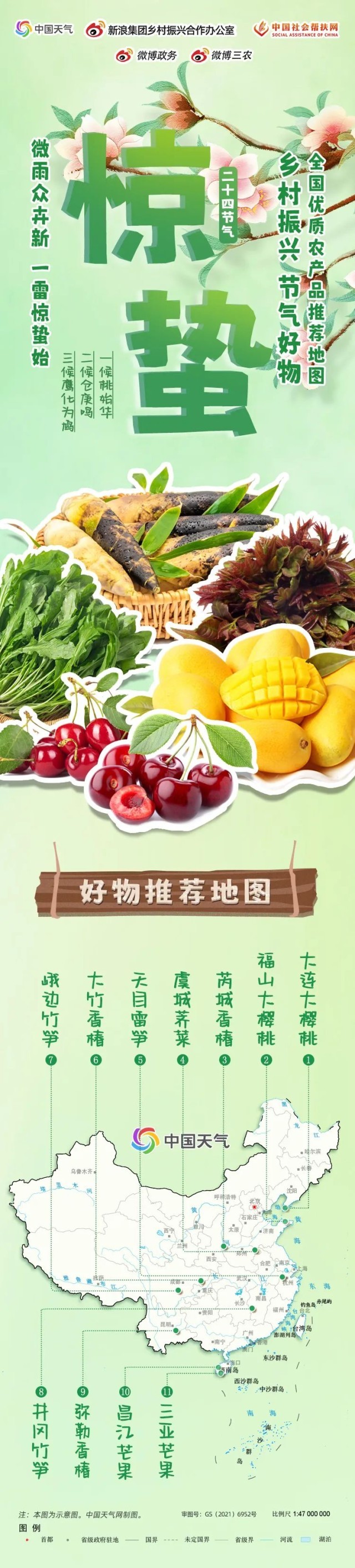 在這個春雷乍響,萬物生長的節(jié)氣里,又有哪些春季的舌尖美味呢,來看看由中國天氣網(wǎng)、中國社會幫扶網(wǎng)聯(lián)合推出的“鄉(xiāng)村振興·節(jié)氣好物”全國優(yōu)質(zhì)農(nóng)產(chǎn)品推薦地圖驚蟄篇吧!