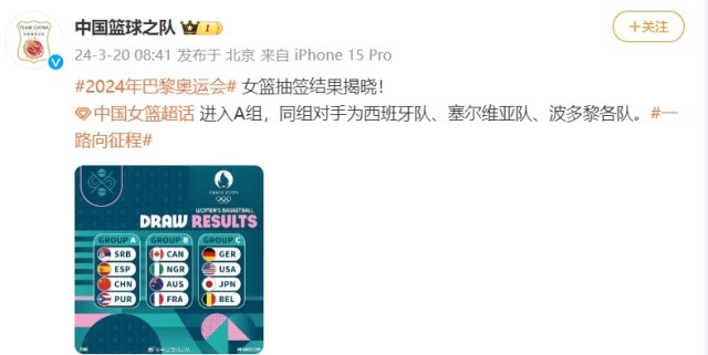巴黎奧運會女籃抽簽結果揭曉 中國女籃進入A組