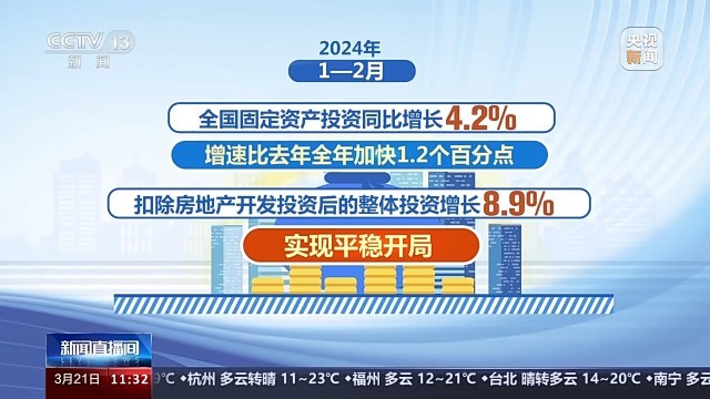 國家發(fā)展和改革委員會副主任劉蘇社介紹,今年以來,國家發(fā)展改革委會同有關(guān)方面,充分發(fā)揮政府投資的帶動放大效應(yīng),積極支持社會資本參與重大項(xiàng)目建設(shè),著力擴(kuò)大有效益的投資。1—2月,全國固定資產(chǎn)投資同比增長4.2%,增速比去年全年加快1.2個(gè)百分點(diǎn);扣除房地產(chǎn)開發(fā)投資后的整體投資增長8.9%,實(shí)現(xiàn)平穩(wěn)開局。