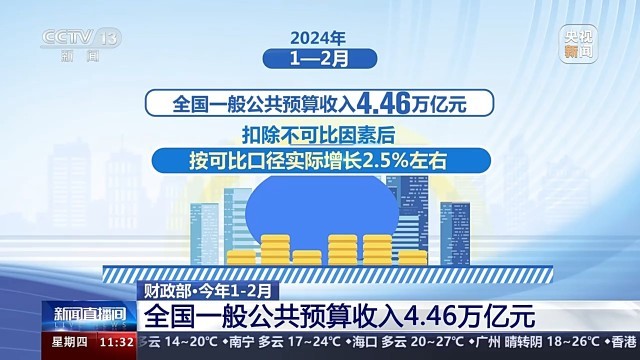 財(cái)政部副部長廖岷介紹,今年1—2月,全國一般公共預(yù)算收入4.46萬億元,扣除不可比因素后,按可比口徑實(shí)際增長2.5%左右,保持恢復(fù)性增長,與宏觀經(jīng)濟(jì)穩(wěn)中向好的態(tài)勢基本保持一致;全國一般公共預(yù)算支出同比增長6.7%,完成全年預(yù)算的15.3%,支出進(jìn)度為近5年同期最快。