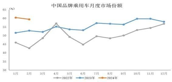 2024年1-2月,中國品牌乘用車銷量206.6萬輛,同比增長26.7%,市場份額為59.9%,上升7.6個(gè)百分點(diǎn)。