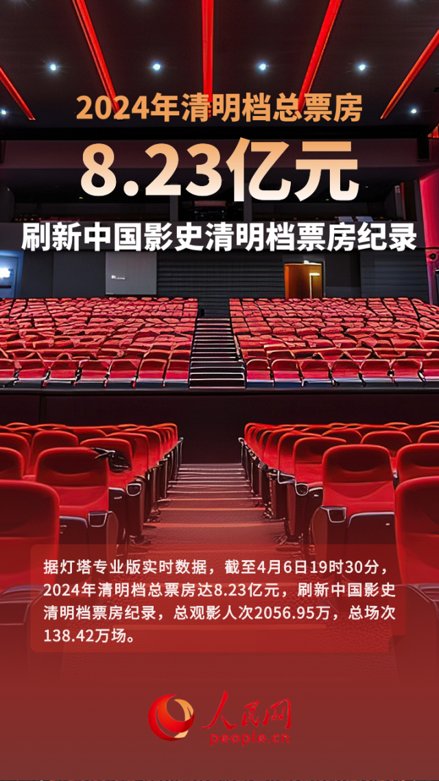 據(jù)燈塔專業(yè)版實時數(shù)據(jù),截至4月6日19時30分,2024年清明檔總票房達(dá)8.23億元,刷新中國影史清明檔票房紀(jì)錄,總觀影人次2056.95萬,總場次138.42萬場。