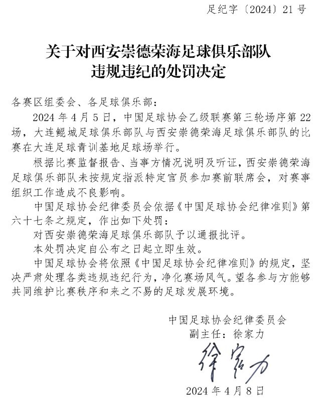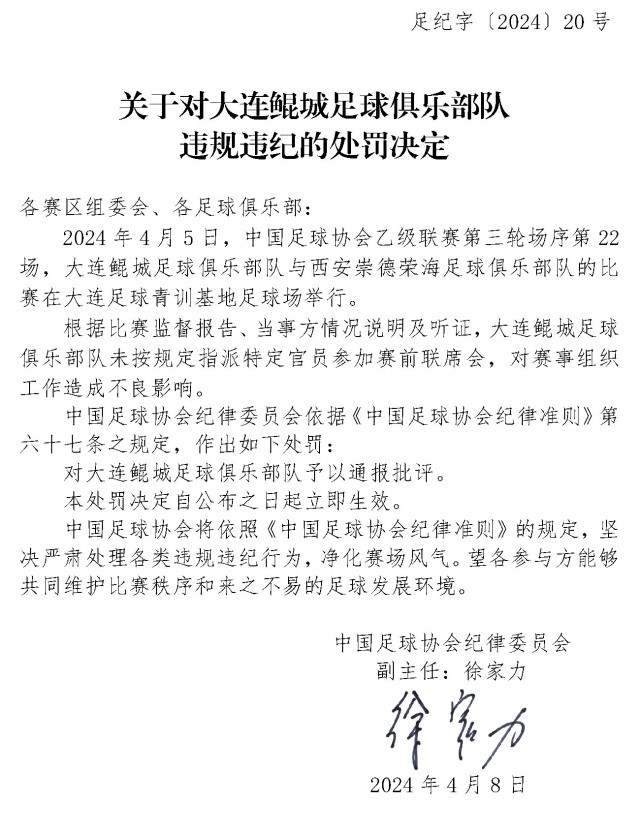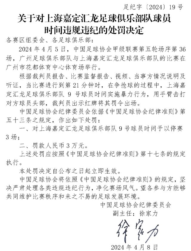 央視網(wǎng)消息:4月10日,中國足協(xié)網(wǎng)站發(fā)布《關(guān)于對(duì)上海嘉定匯龍足球俱樂部隊(duì)球員時(shí)間違規(guī)違紀(jì)的處罰決定》《關(guān)于對(duì)西安崇德榮海足球俱樂部隊(duì)違規(guī)違紀(jì)的處罰決定》《關(guān)于對(duì)大連鯤城足球俱樂部隊(duì)違規(guī)違紀(jì)的處罰決定》三份處罰決定。中甲聯(lián)賽上海嘉定匯龍9號(hào)球員因暴力行為被停賽罰款。中乙聯(lián)賽大連鯤城與西安崇德榮海兩家俱樂部因未按規(guī)定指派特定官員參加賽前聯(lián)席會(huì),被通報(bào)批評(píng)。