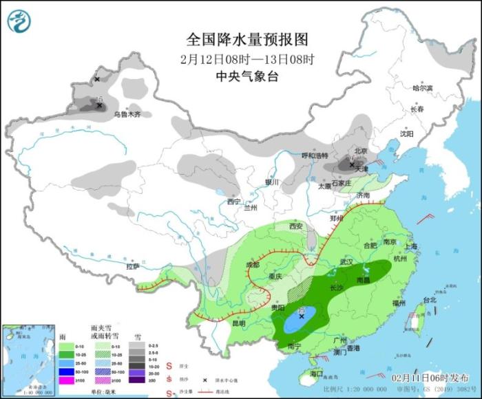 2月12日8時至13日8時,新疆伊犁河谷和南疆盆地、西藏北部、青海北部、甘肅河西、內(nèi)蒙古中西部、黑龍江北部、陜西北部、華北大部、川西高原南部等地部分地區(qū)有小到中雪,其中,新疆伊犁河谷、河北中部、天津中部等地部分地區(qū)有大雪,局地有暴雪(10~15毫米)。黃淮大部、江淮、江漢大部、江南、西南地區(qū)東部和南部、華南、臺灣島等地部分地區(qū)有小到中雨,其中,廣西北部等地部分地區(qū)有大雨(25~45毫米)。
