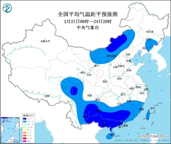 受持續(xù)陰雨雪和冷空氣共同影響,我國南方大部地區(qū)氣溫將顯著偏低。預計21日08時至24日20時,貴州、四川西部和南部、湖南南部、江西中南部、云南東部、廣西、廣東、福建、海南和臺灣島等地的日平均氣溫較歷史同期偏低5℃以上,其中,云南東部、貴州南部、湖南南部、江西南部、廣西大部、廣東中西部等地偏低7℃以上,最低氣溫0℃線將壓至貴州南部、湖南南部、江西北部到浙江南部一帶,4℃線將壓至廣西中部到廣東中部一帶。另外,內蒙古中部、吉林、青藏高原東部等地日平均氣溫也較歷史同期偏低5℃,部分地區(qū)偏低7℃。(見圖1、圖2)。