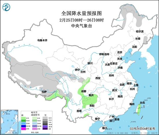 預(yù)計(jì)2月24日14時(shí)至25日14時(shí),新疆南疆西部山區(qū)、西藏北部和西部、青海南部、川西高原東部等地部分道路受小雪或雨夾雪影響;西藏東南部、四川盆地西部、貴州西部、云南東北部等地部分道路受小雨影響;河北中部、浙江西南部、湖北東部和南部、湖南北部、貴州西部和東部、云南東部、四川盆地中部和西部等地部分道路受霧影響能見(jiàn)度低。