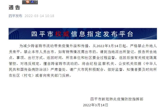 吉林四平:嚴(yán)格禁止外地人員來(lái)平,禁止本市人員出市