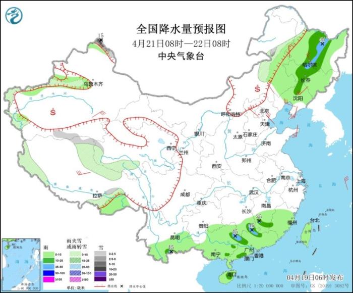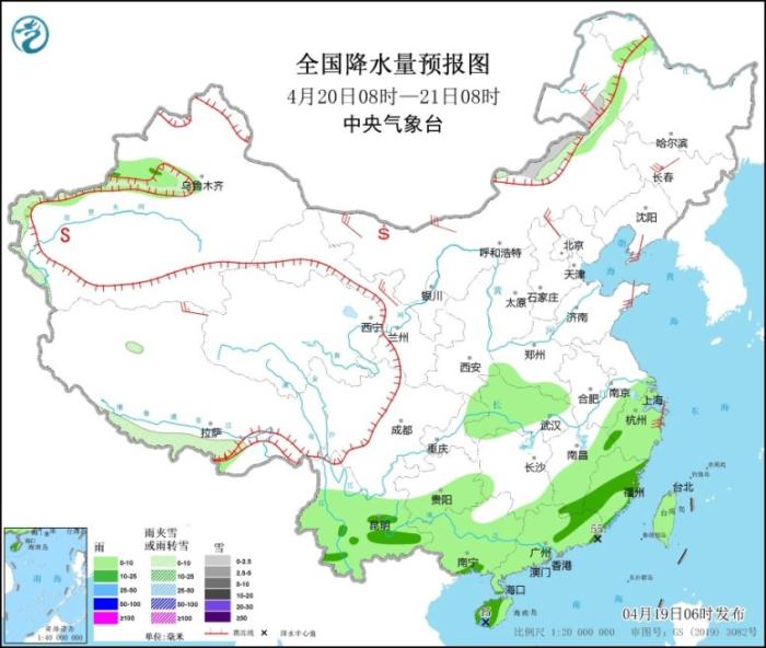 4月19日08時(shí)至20日08時(shí),新疆北疆北部、青海東部、甘肅西南部、川西高原北部等地的部分地區(qū)有小到中雪或雨夾雪;四川南部、貴州中西部、云南東部和南部、福建南部、廣東、臺(tái)灣島等地的部分地區(qū)有中到大雨,其中云南南部等地局地暴雨(50~55毫米)。新疆北部和沿天山地區(qū)、內(nèi)蒙古、東北地區(qū)、山東半島、西藏中東部、青海南部和東部等地的部分地區(qū)有4~6級(jí)風(fēng),其中新疆北部、西藏中部部分地區(qū)有6~7級(jí)風(fēng)(見(jiàn)圖1);渤海有5~6級(jí)、陣風(fēng)7級(jí)的西南風(fēng),臺(tái)灣海峽、南海北部海域有5~6級(jí)、陣風(fēng)7級(jí)的偏東到東北風(fēng)。
