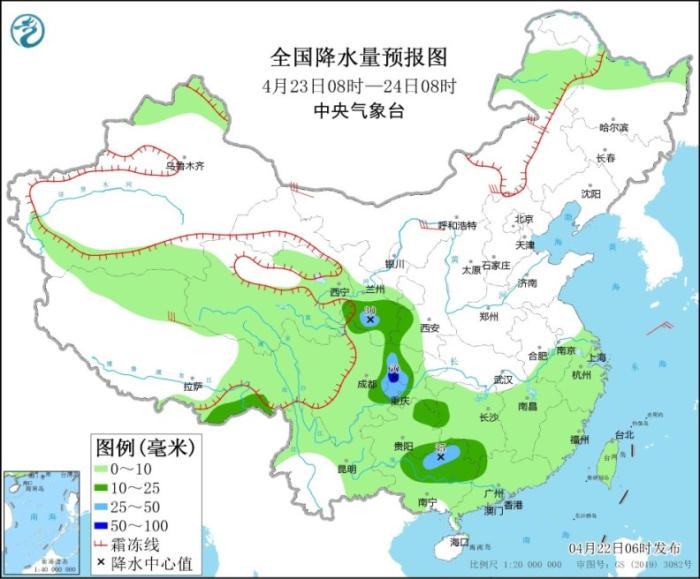 圖2 全國降水量預報圖(4月23日08時-24日08時)