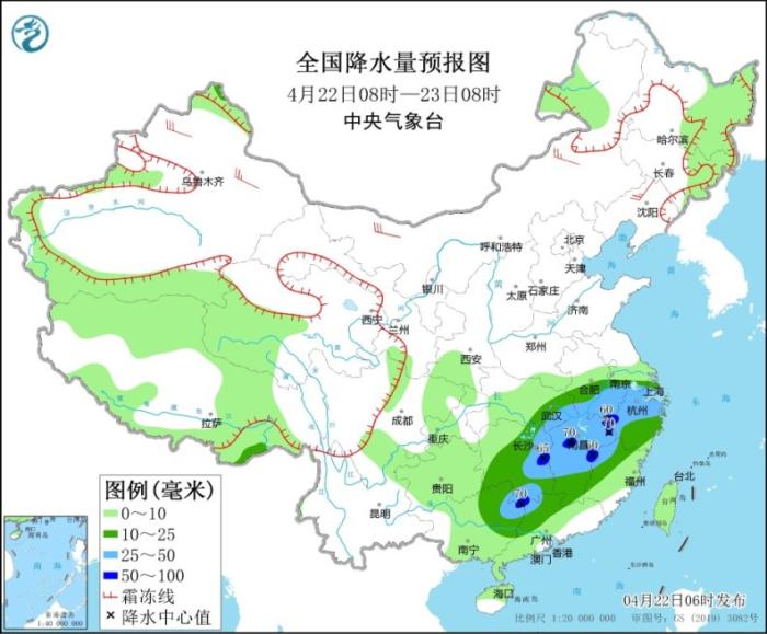 4月22日08時至23日08時,新疆北疆北部、青海南部、西藏北部等地部分地區(qū)有小到中雪或雨夾雪,局地有大到暴雪。江淮南部、江漢東部、江南大部、華南北部等地部分地區(qū)有中到大雨,其中,安徽南部、湖南東部、江西中北部、浙江西部、廣西東北部等地局地有暴雨(50~70毫米)。新疆北部、內蒙古、東北南部等地部分地區(qū)有4~6級風(見圖1)。