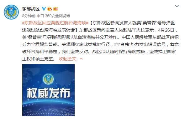 東部戰(zhàn)區(qū)回應(yīng)美艦過航臺灣海峽:全程跟監(jiān)警戒
