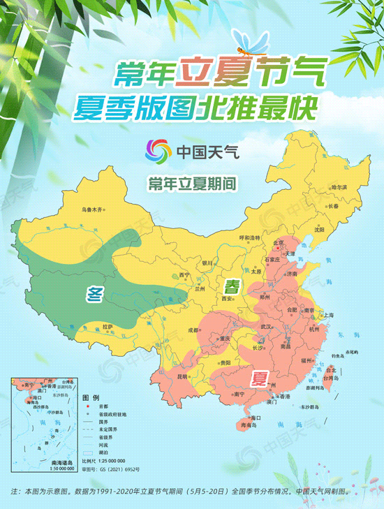 常年立夏節(jié)氣期間,全國夏季版圖開始迅速北推,且速度是最快的。夏天的腳步從華南、江南中部等地一路北擴,越過長江、江漢平原等地,最北能抵達華北中部地區(qū),長沙(5月11日)、武漢(5月12日)、鄭州(5月17日)、濟南(5月17日)、石家莊(5月17日)、合肥(5月18日)、天津(5月18日)、南京(5月19日)等城市常年均在立夏節(jié)氣期間入夏。