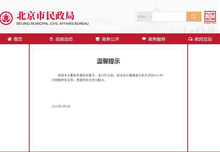 北京:5月5日起,結(jié)婚登記須持48小時內(nèi)核酸陰性證明