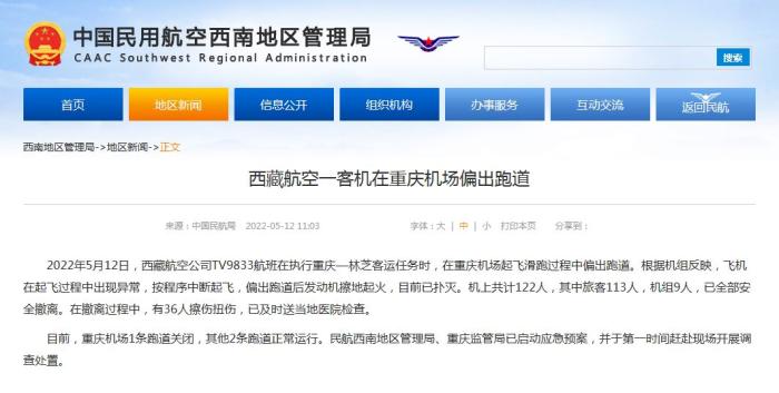 中新網(wǎng)5月12日電 據(jù)民航局網(wǎng)站消息,民航局今日就西藏航空一客機(jī)在重慶機(jī)場(chǎng)偏出跑道發(fā)布通報(bào)。通報(bào)稱(chēng),2022年5月12日,西藏航空公司TV9833航班在執(zhí)行重慶—林芝客運(yùn)任務(wù)時(shí),在重慶機(jī)場(chǎng)起飛滑跑過(guò)程中偏出跑道。根據(jù)機(jī)組反映,飛機(jī)在起飛過(guò)程中出現(xiàn)異常,按程序中斷起飛,偏出跑道后發(fā)動(dòng)機(jī)擦地起火,目前已撲滅。機(jī)上共計(jì)122人,其中旅客113人,機(jī)組9人,已全部安全撤離。在撤離過(guò)程中,有36人擦傷扭傷,已及時(shí)送當(dāng)?shù)蒯t(yī)院檢查。