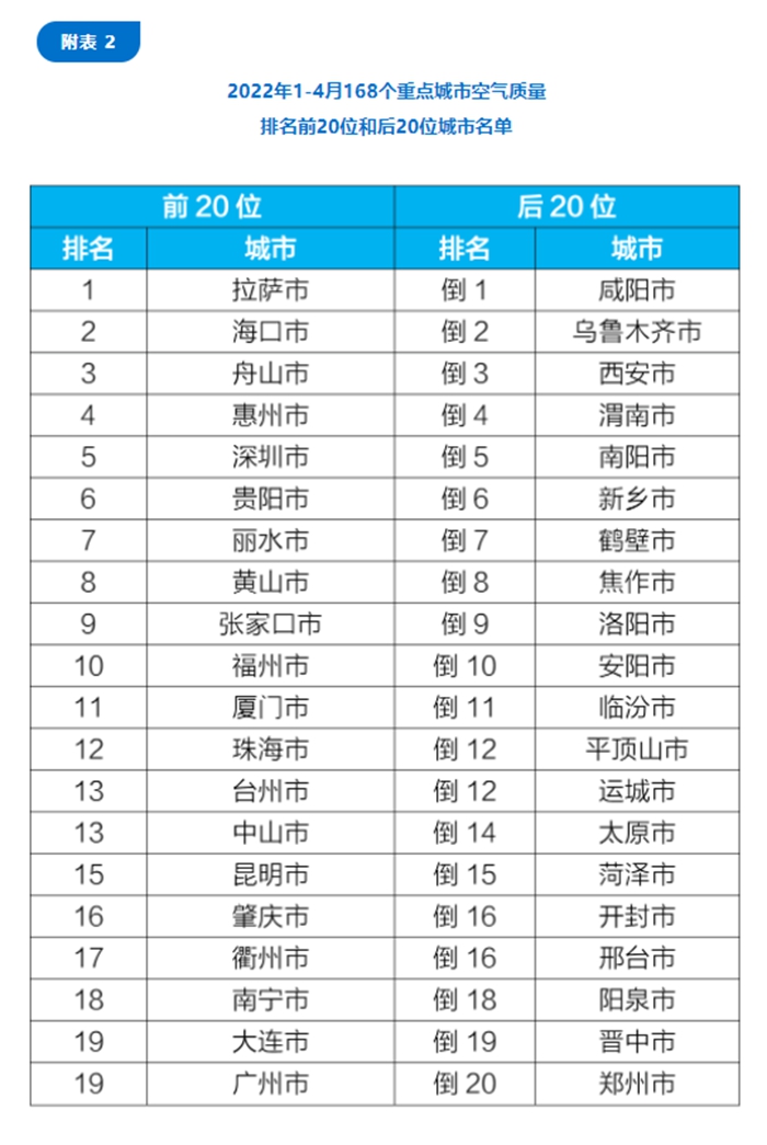 1—4月,168個(gè)重點(diǎn)城市中,拉薩、??诤椭凵绞械?0個(gè)城市空氣質(zhì)量相對(duì)較好;咸陽、烏魯木齊和西安市等20個(gè)城市空氣質(zhì)量相對(duì)較差。(完)