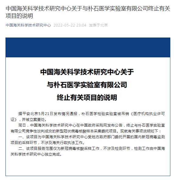 中新網5月23日電 中國海關科學技術研究中心22日在其微信公眾號發(fā)布關于與樸石醫(yī)學實驗室有限公司終止有關項目的說明稱,據平安北京5月21日發(fā)布情況通報,樸石醫(yī)學檢驗實驗室被吊銷《醫(yī)療機構執(zhí)業(yè)許可證》,并被立案查處。同日,中國海關科學技術研究中心在中國政府采購網發(fā)布公告,終止與樸石醫(yī)學實驗室有限公司競爭性談判成交的新型冠狀病毒核酸樣本采集委托項目。