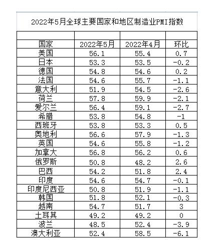 中國物流與采購聯(lián)合會網站發(fā)布的2022年5月份全球主要國家制造業(yè)PMI指數(shù)截圖。
