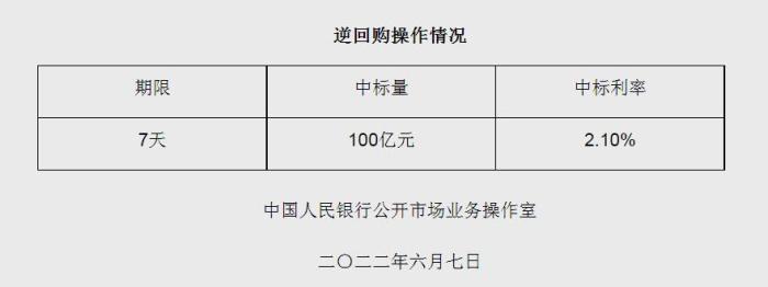 央行6月7日開展100億元逆回購(gòu)操作 中標(biāo)利率2.10%