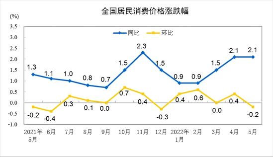 中新財經6月10日電 國家統(tǒng)計局10日公布數(shù)據顯示,2022年5月份,全國居民消費價格(CPI)同比上漲2.1%。其中,食品價格上漲2.3%,非食品價格上漲2.1%。